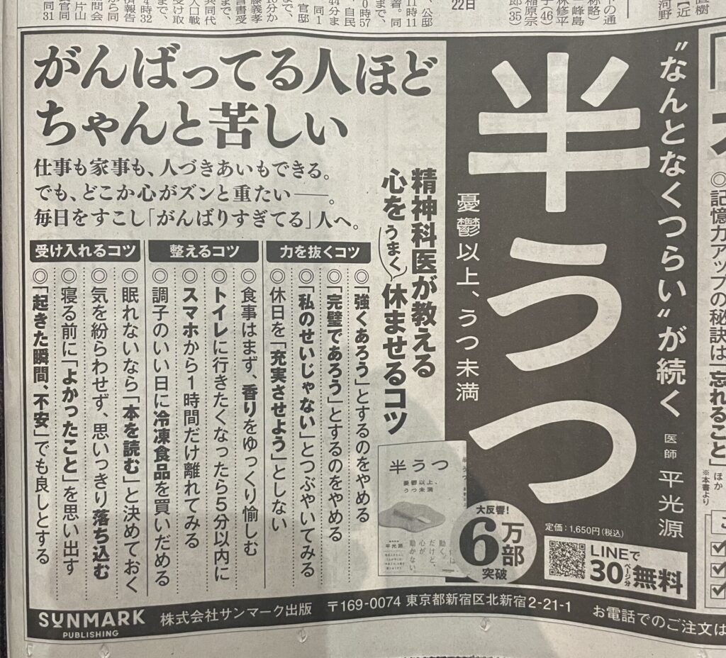 『半うつ 〜憂鬱以上、うつ未満〜』(サンマーク出版)が紙面で紹介されました。